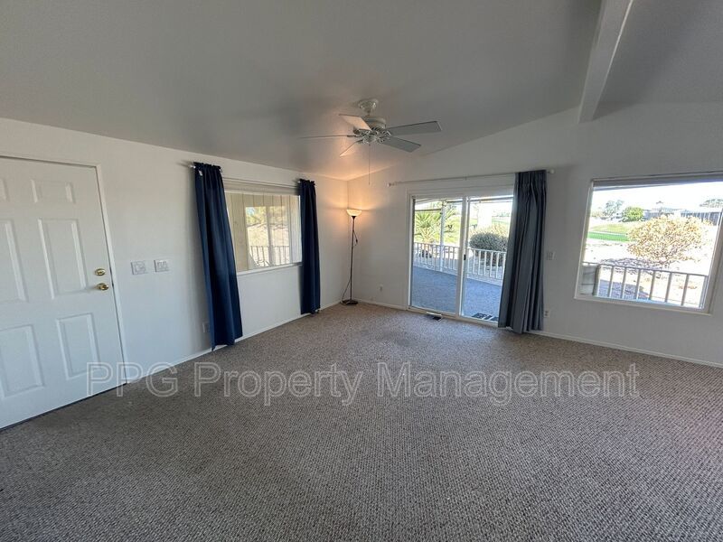 Nestled within a prestigious guard-gated, AGR RESTRICTED 55+ Happy Trails community, this stunning home offers breathtaking views on a beautiful golf course lot. Recently refreshed with new interior paint, the home boasts an inviting and modern ambiance. Dual-pane windows provide energy efficiency and abundant natural light, while ceiling fans in every room ensure year-round comfort.