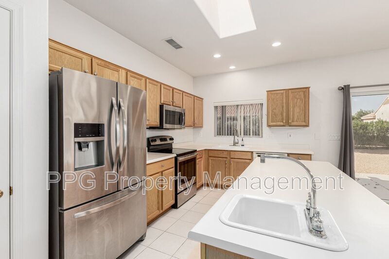 The spacious kitchen is a highlight, complete with a large island ideal for entertaining or casual dining. Oak cabinetry provides ample storage, while stainless steel appliances add a modern touch. Skylights in the kitchen and foyer fill the home with natural light, creating an inviting ambiance. Every room is equipped with ceiling fans to keep you comfortable year-round.