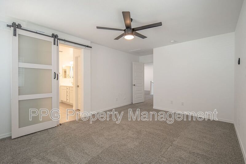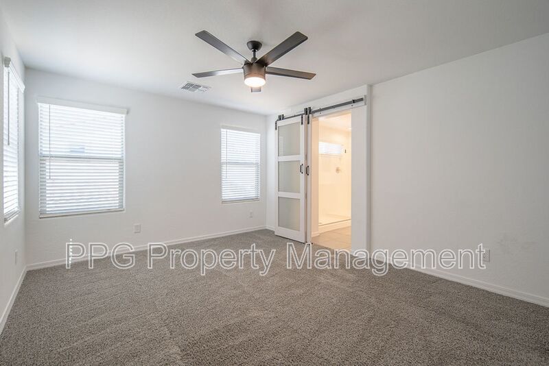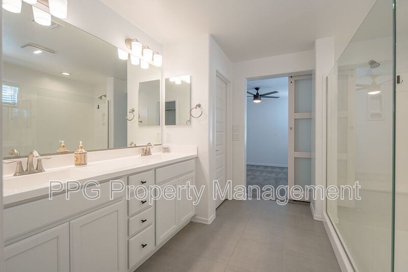 Each room is equipped with ceiling fans to keep things cool and energy-efficient. The primary bedroom offers a serene retreat with a custom barn door leading into a private bathroom featuring a walk-in shower, a generous walk-in closet, and raised vanities for added luxury. A convenient washer/dryer combo and a modern tankless water heater ensure your day-to-day routines are effortless.