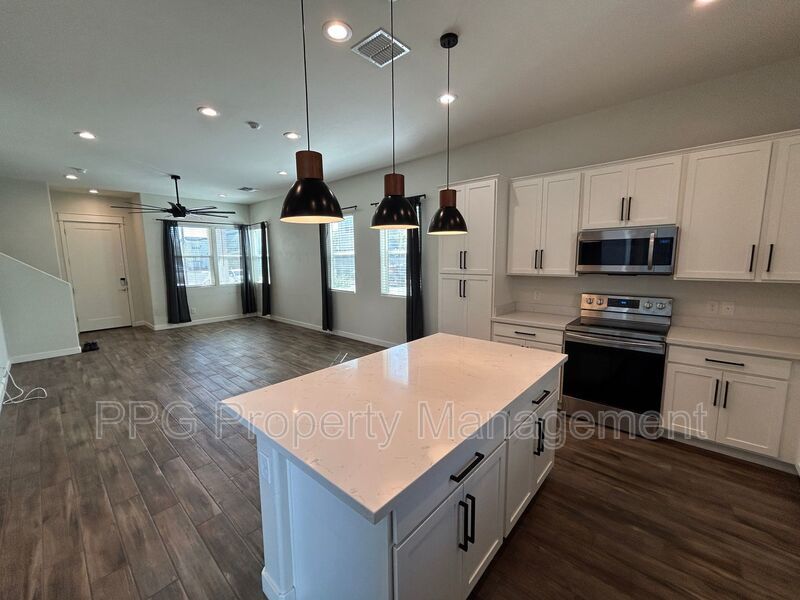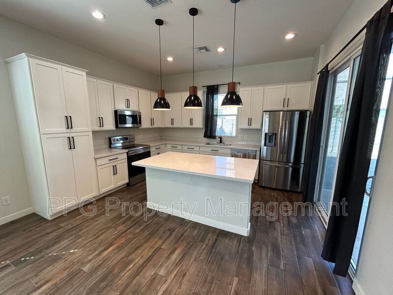 Step into this beautifully designed rental home, perfectly situated on a desirable corner lot. The interior showcases wood-look ceramic tile flooring throughout, creating a seamless blend of durability and modern style. The kitchen is a true centerpiece, featuring sleek quartz countertops, upgraded cabinetry, and stainless steel appliances that elevate both form and function.