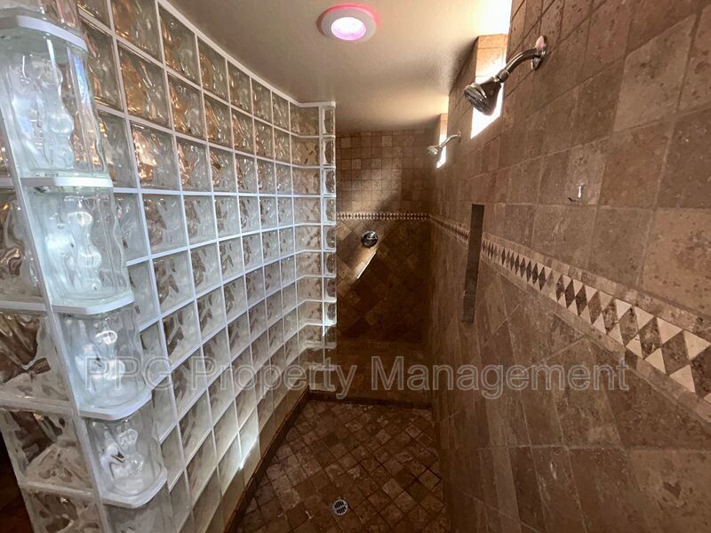 The primary suite includes a luxurious bathroom with a dual entrance shower enhanced by elegant glass block details, as well as a spacious walk-in closet. Guests will appreciate the convenience of a Jack and Jill bathroom connecting the secondary bedrooms, which are generously sized and feature ceiling fans in every room for added comfort.