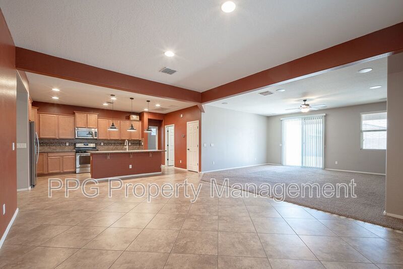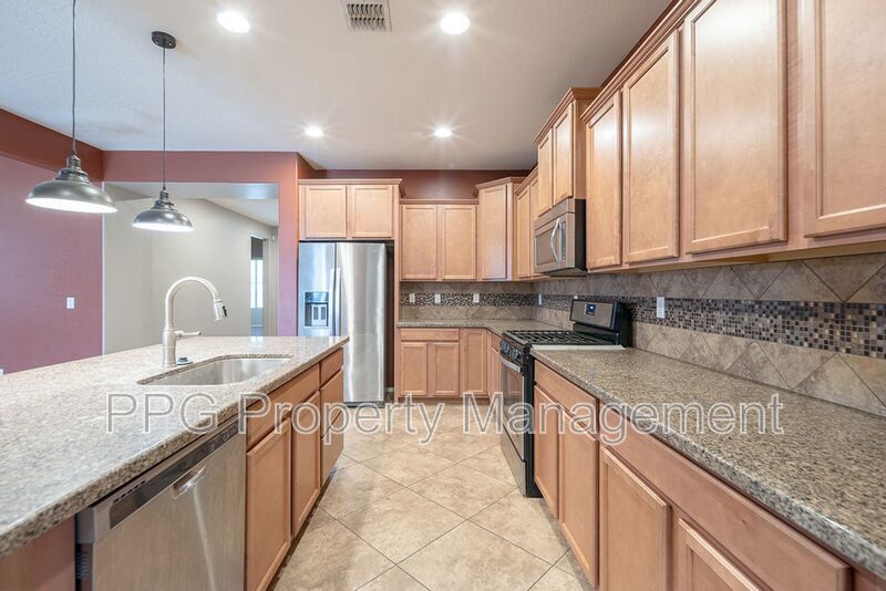 This home sits on an oversized homesite and offers 3 oversized bedrooms & 2 baths with 1990 SqFt with an open great room floor plan, spacious dining area & split bedrooms. The kitchen features staggered maple cabinets with crown molding, granite counters, tile backsplash, gas range, stainless appliances, & island with breakfast bar & pendant lighting. The great room has surround sound, custom feature wall, & sliding doors that lead out to the covered patio with a gas stub for your BBQ, and a large backyard. The main bedroom has a big walk-in closet, sitting area perfect for a home office or nursery, & en-suite bath with privacy door, dual sink vanity, and oversized tiled shower with bench seating. *