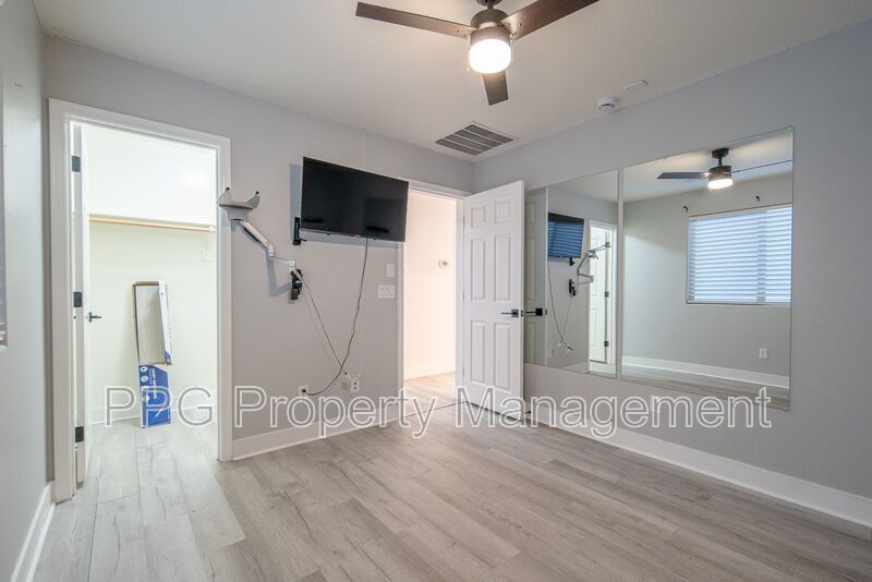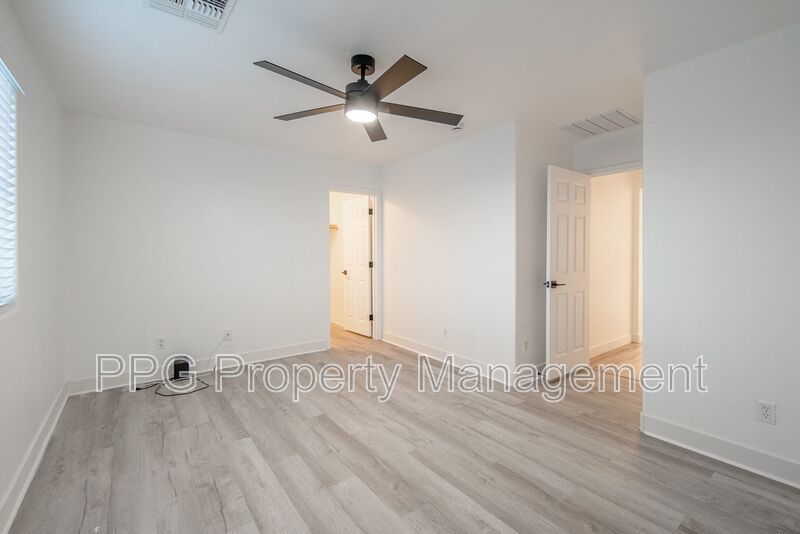 Inside the main residence, the kitchen shines with upgraded quartz countertops, stainless steel appliances, and a modern design that flows into the living spaces. Wood and tile flooring runs throughout, complemented by upgraded light fixtures, ceiling fans, and 2-inch wood blinds. The bathrooms have been thoughtfully updated with upgraded vanities and walk-in showers, while the primary suite provides a spa-like experience with a soaking tub, dual sinks, and a separate living room attached for added privacy and comfort.