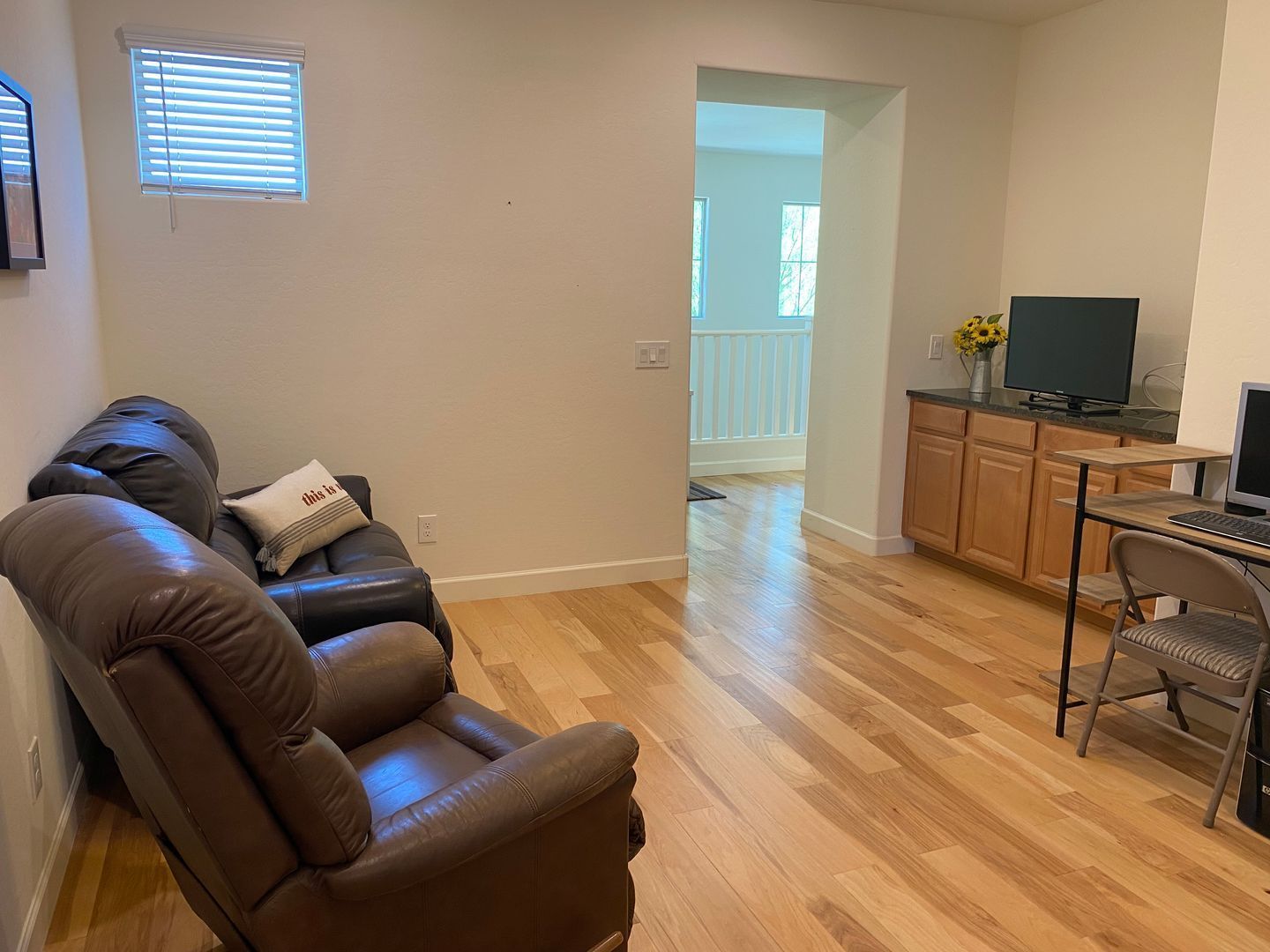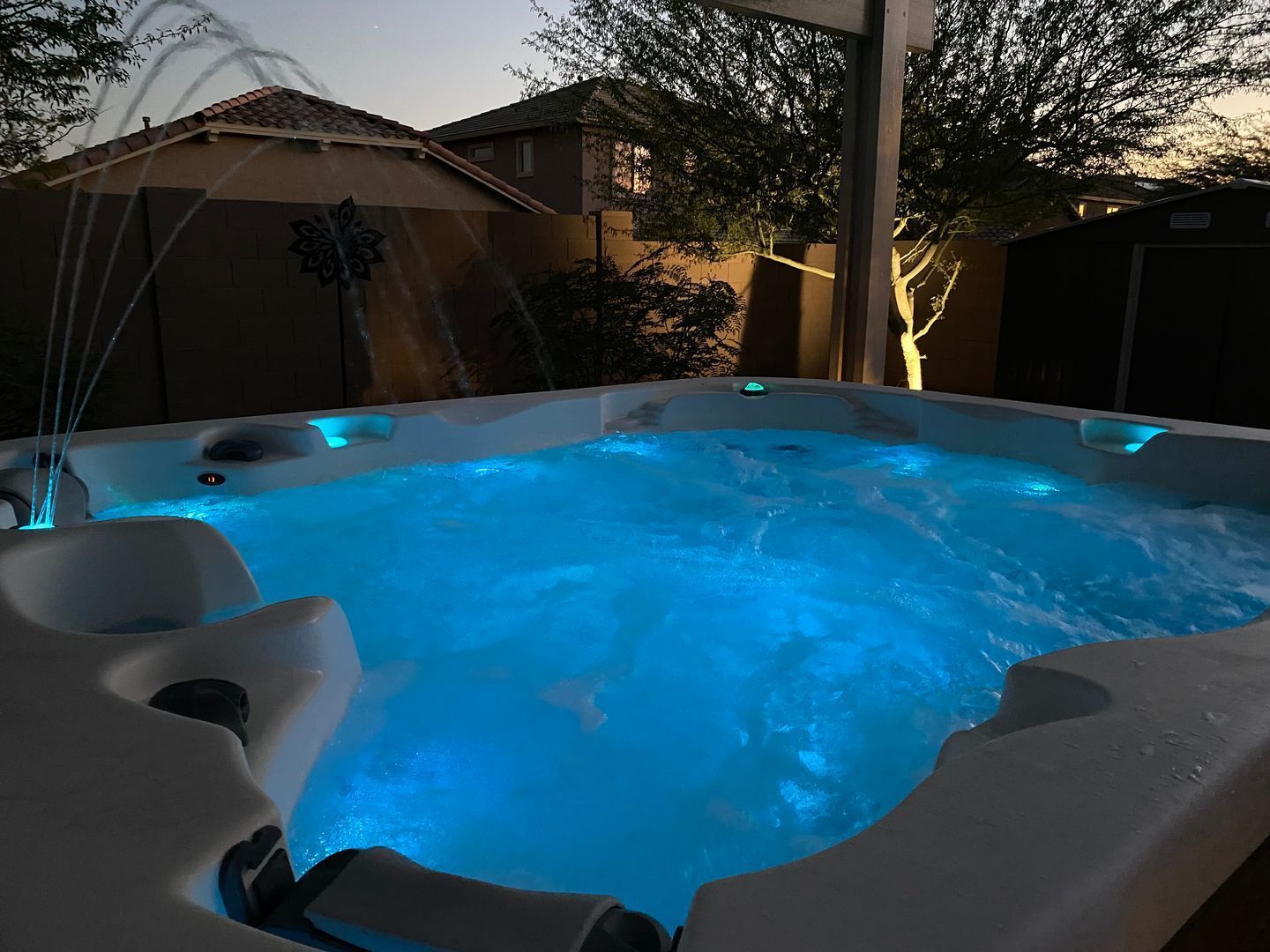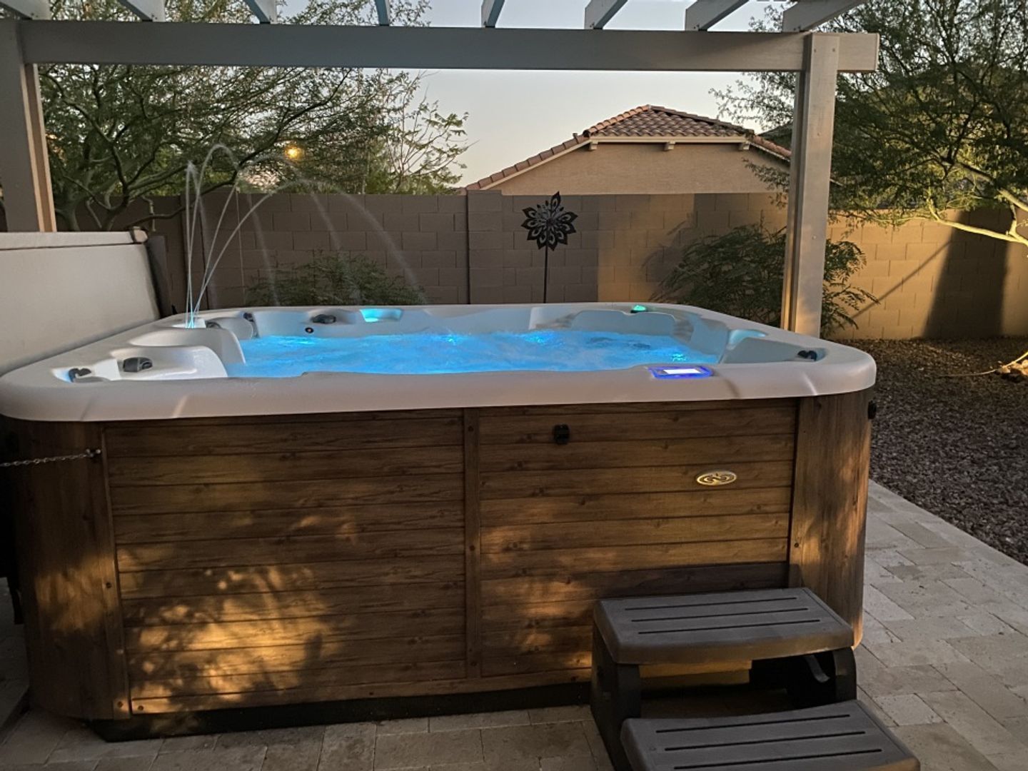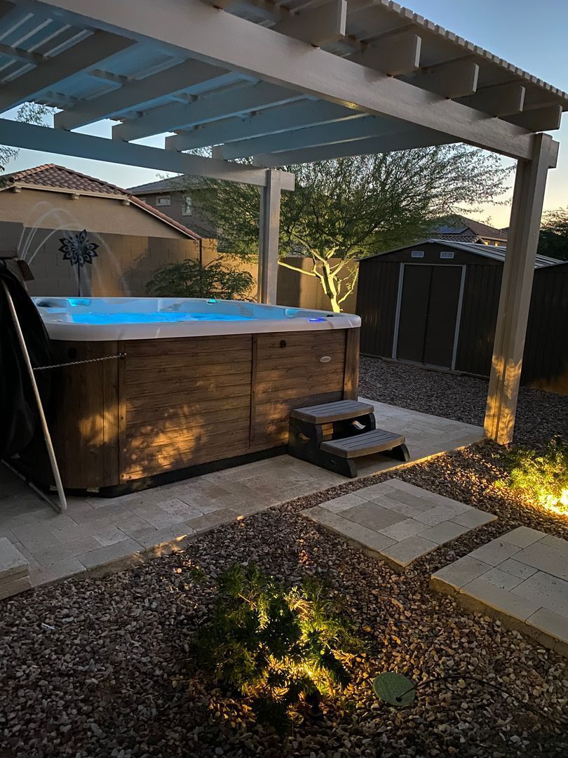 The gourmet kitchen features granite countertops, a large island and breakfast bar, stainless steel appliances including a refrigerator and microwave, gas stove and water heater, and a walk-in pantry for extra storage. Upstairs, you’ll find a laundry room with washer and dryer included, a loft area, and well-appointed bedrooms. The primary suite offers double sinks, a walk-in shower, a separate toilet room, and a large walk-in closet. The secondary bathroom also features double sinks for added convenience. Downstairs, the home includes a private mother-in-law/guest suite with its own complete kitchen, one bedroom, full bath, and laundry area—perfect for extended family or guests. Enjoy hardwood, tile, and carpet flooring throughout, ceiling fans and blinds in every room, and plenty of natural light. Step outside to a covered patio and relax in the hot tub. A two-car garage with 220 EV charging station provides ample parking and storage space. Close to the TSMC Arizona Manufacturing Campus! This home combines modern amenities with thoughtful design—perfect for comfortable family living or entertaining guests.