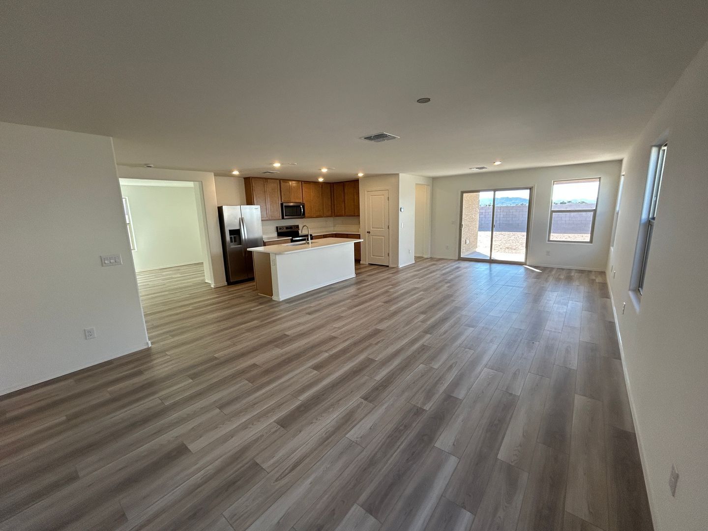 Welcome to this brand new, never-lived-in home located in Buckeye and ready for immediate move-in. This thoughtfully designed residence offers three spacious bedrooms, two full bathrooms, and an additional den that is perfect for a home office or flex space. The home features a stylish combination of laminate wood flooring and plush carpet, complemented by upgraded countertops and cabinetry throughout. The modern kitchen is equipped with stainless steel appliances, a farmhouse sink, and recessed lighting that continues through the entire home, creating a bright and inviting atmosphere. Blinds will be installed on all windows for added comfort and privacy. The primary suite includes a walk-in closet and a beautifully appointed bathroom with a walk-in shower and dual sinks. Step outside to enjoy a covered patio and desirable north/south exposure, with no neighbors behind for added privacy. This is a rare opportunity to lease a pristine, move-in-ready home in a growing Buckeye community.