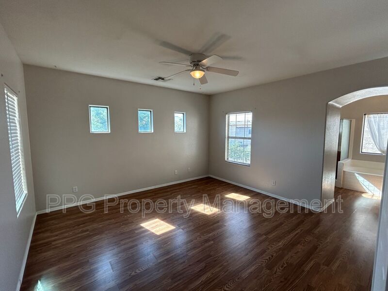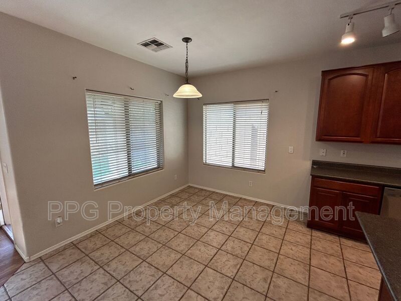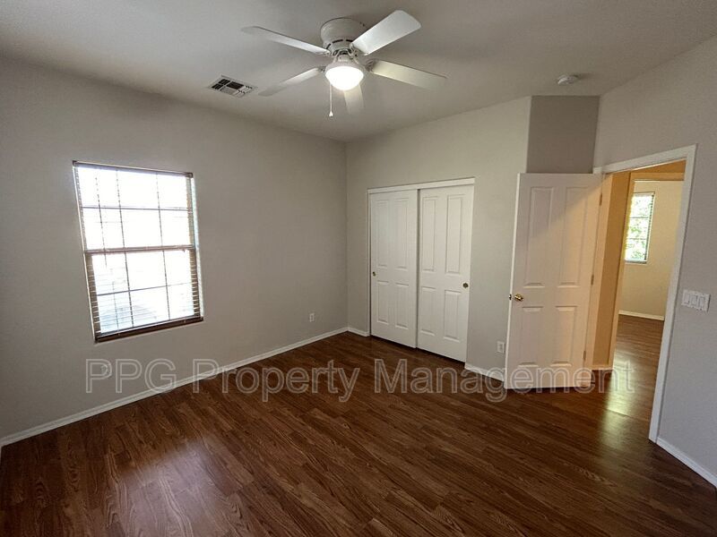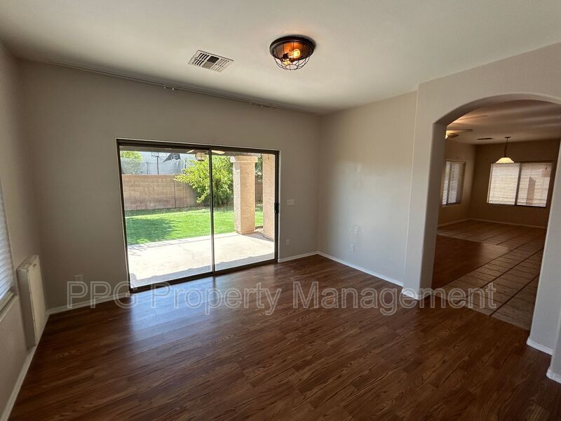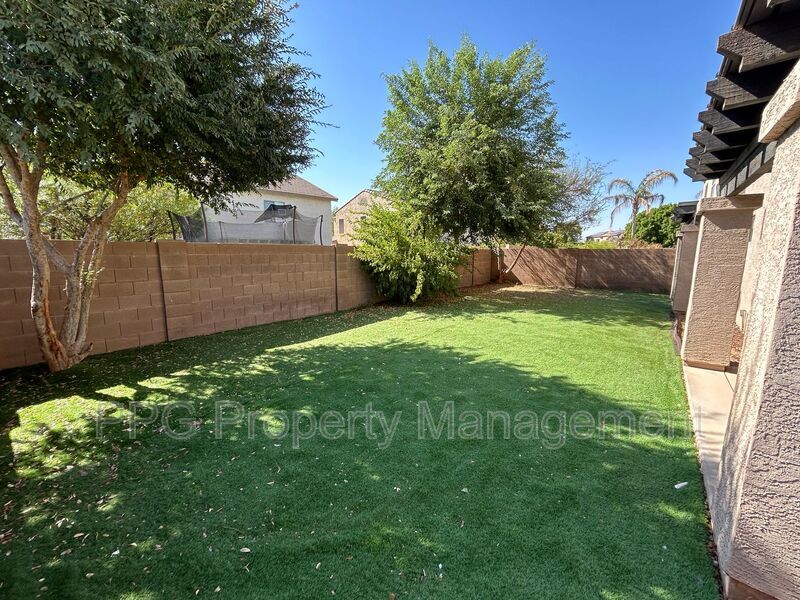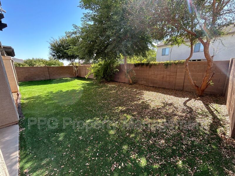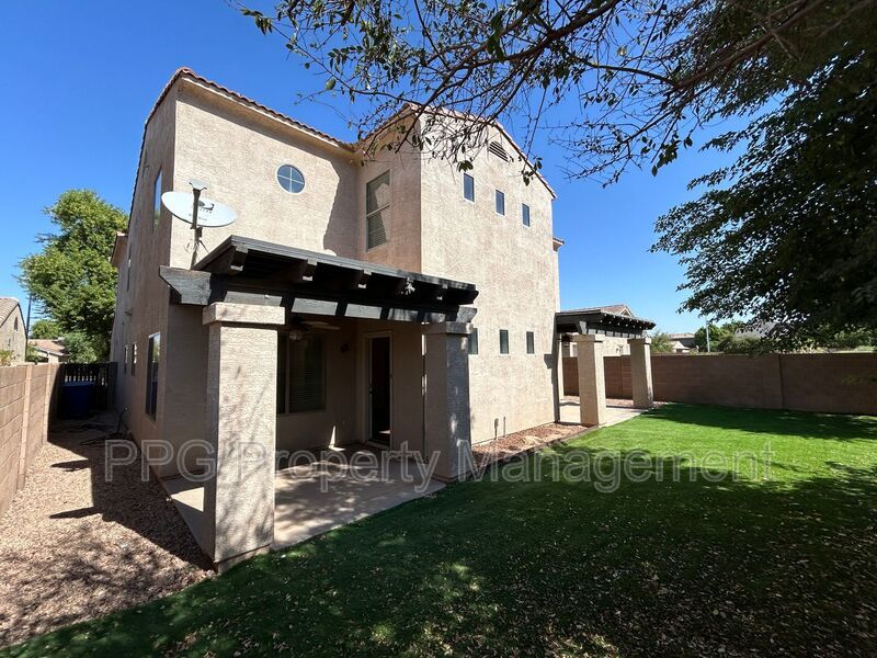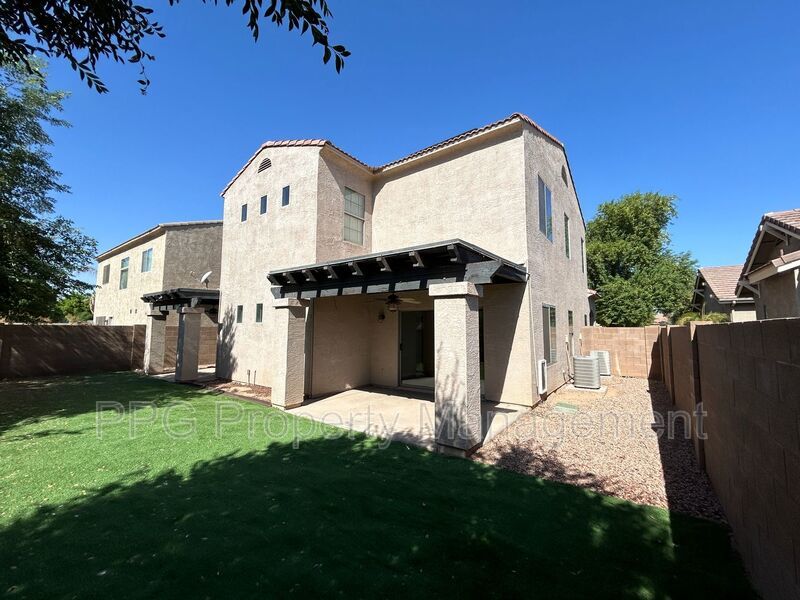 Welcome to this beautiful 4 bedroom, 2.5 bathroom home located in Legacy Parc ready for immediate move-in. This SOLAR home (low electric bills) features wood and tile flooring throughout, stainless steel kitchen appliances, a den and loft for extra living space, ceiling fans in all rooms for added comfort, extra large laundry room with sink and cabinets, a walk-in shower in the primary bathroom and a large walk-in closet in the primary bedroom. Enjoy the convenience of 2" wood blinds, artificial turf in both the front and backyard, and the privacy of being located in a cul-de-sac adds the cherry on top. Relax and entertain on the two covered patios, perfect for enjoying the beautiful Arizona weather. Don't miss out on this amazing home!