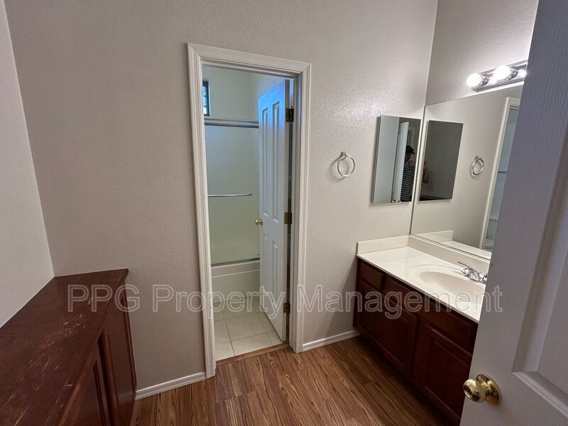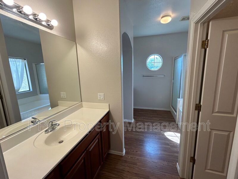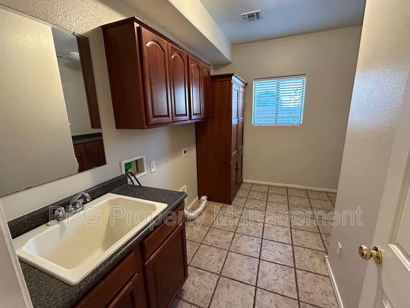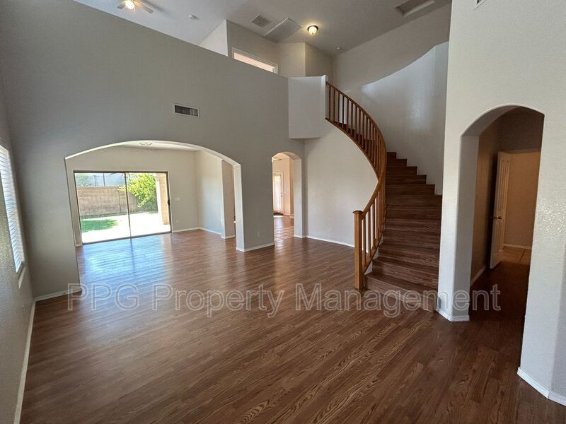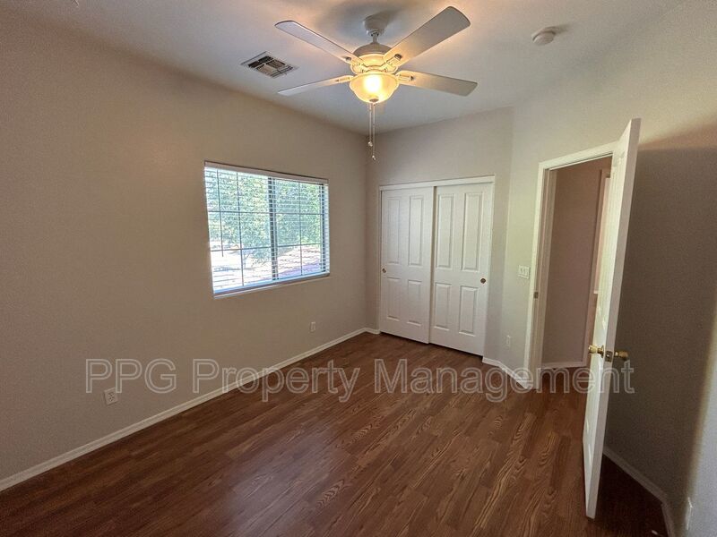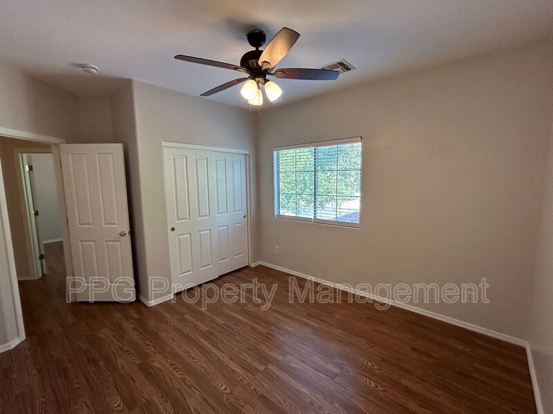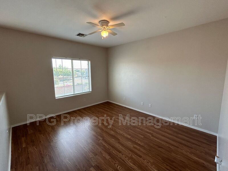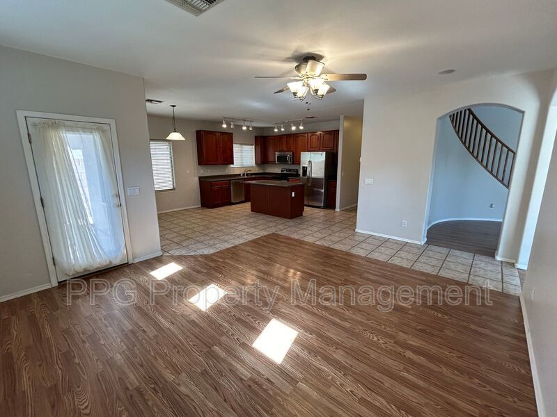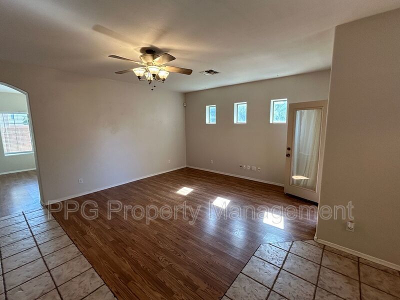 Welcome to this beautiful 4 bedroom, 2.5 bathroom home located in Legacy Parc ready for immediate move-in. This SOLAR home (low electric bills) features wood and tile flooring throughout, stainless steel kitchen appliances, a den and loft for extra living space, ceiling fans in all rooms for added comfort, extra large laundry room with sink and cabinets, a walk-in shower in the primary bathroom and a large walk-in closet in the primary bedroom. Enjoy the convenience of 2" wood blinds, artificial turf in both the front and backyard, and the privacy of being located in a cul-de-sac adds the cherry on top. Relax and entertain on the two covered patios, perfect for enjoying the beautiful Arizona weather. Don't miss out on this amazing home!